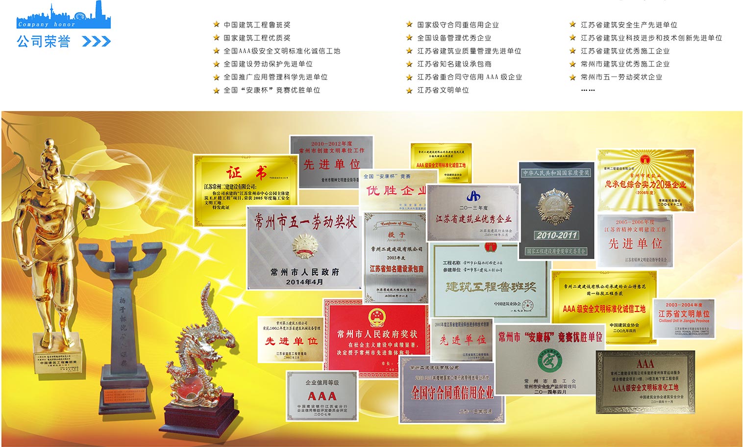 公司堅持“艱苦奮斗、團結敬業、求實創新、開拓進取”的企業精神,實施“質量為本、精心施工創好的服務優先、誠信守約為用戶”的質量方針。嚴格履行合同,講究信用,八七年以來連續被評為江蘇省AAA 級“守合同、重信用”企業,并榮獲國家 級“重合同、守信用”企業。